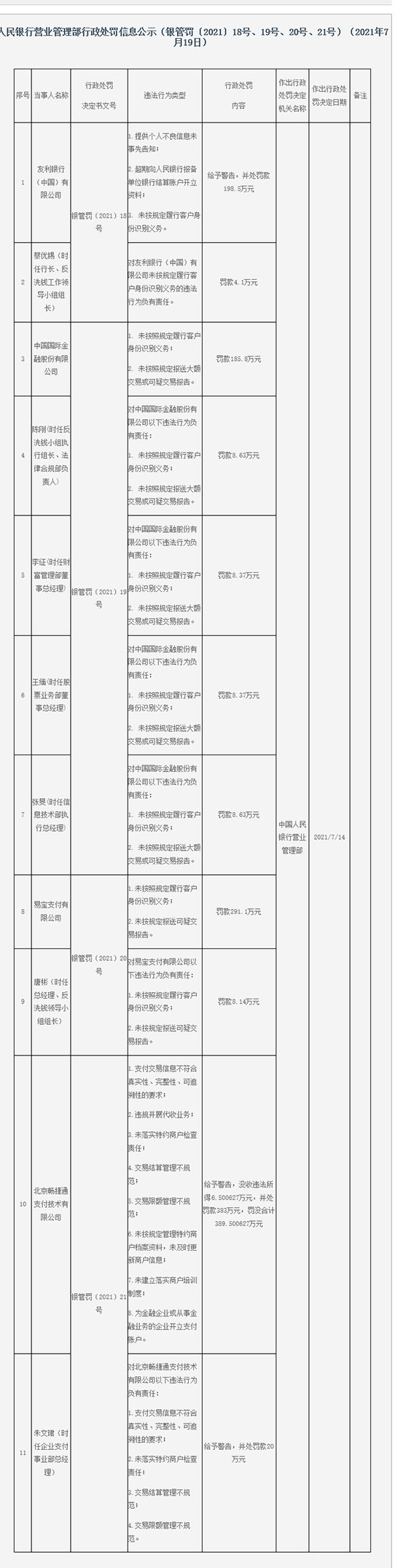 人民网北京7月27日电 (黄盛)近日,中国人民银行营业管理部(北京)公开的银管罚〔2021〕18号到21号行政处罚信息(以下简称“行政处罚信息”)显示,因违反反洗钱等相关管理规定,中国国际金融股份有限公司(以下简称“中金公司”)、易宝支付有限公司(以下简称“易宝支付”)、友利银行(中国)有限公司(以下简称“友利银行”)和北京畅捷通支付技术有限公司(以下简称“畅捷通支付”)4家机构及其7位相关责任人被罚,合计罚没1131.14万元。