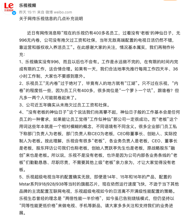 从这个角度来看,近日乐视公开宣称当下和以后不会有“996”,并且从未拖欠过员工工资和社保的言论一出,舆论从此前唱衰破产立刻倒向“上班天花板”也就不难理解了。