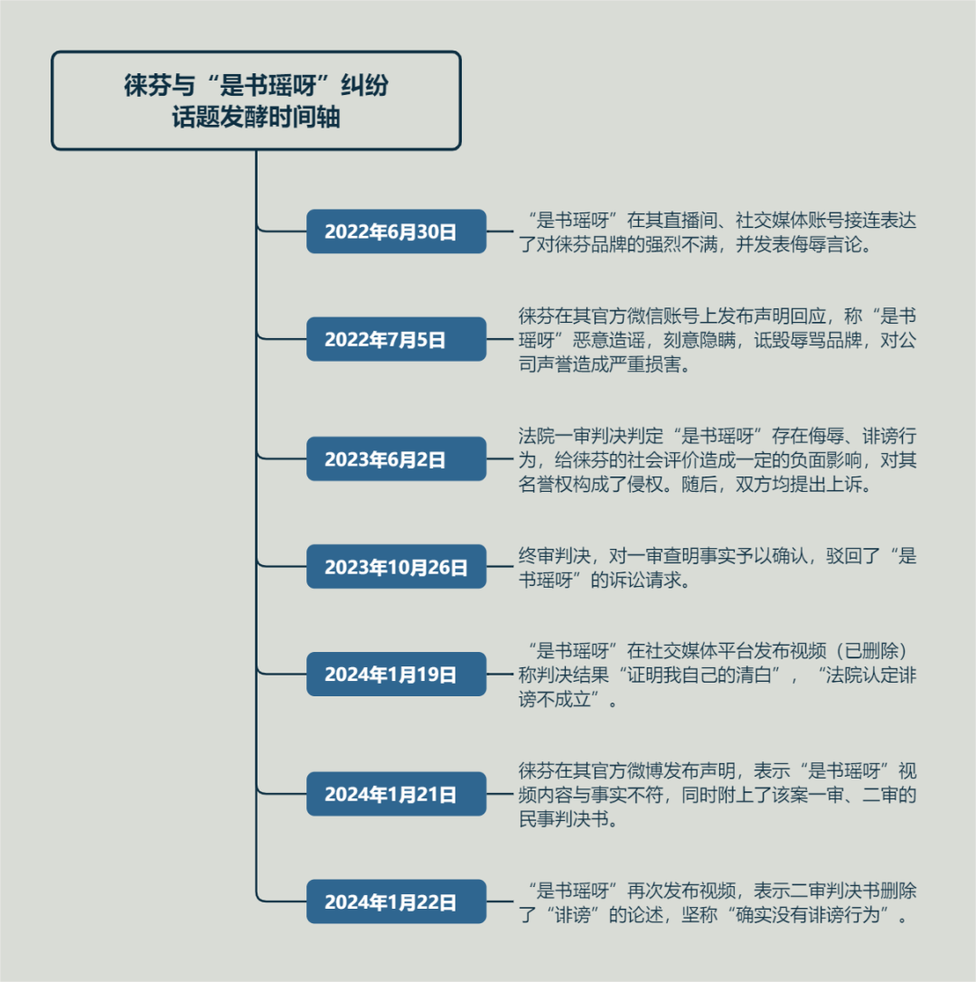 梳理相关报道,事件缘起于2022年6月徕芬与“书瑶”的合作纠纷,因在“合作”过程中产生的矛盾问题(合作后已终止),博主“书瑶”多次在网络上发布相关视频表达对徕芬的不满,徕芬以其言论对公司构成名誉侵权,将博主告上法庭。经过一年多的调查取证和两次庭审,徕芬胜诉,法院判决博主“书瑶”在网络平台发布内容道歉,并赔偿徕芬33万元。