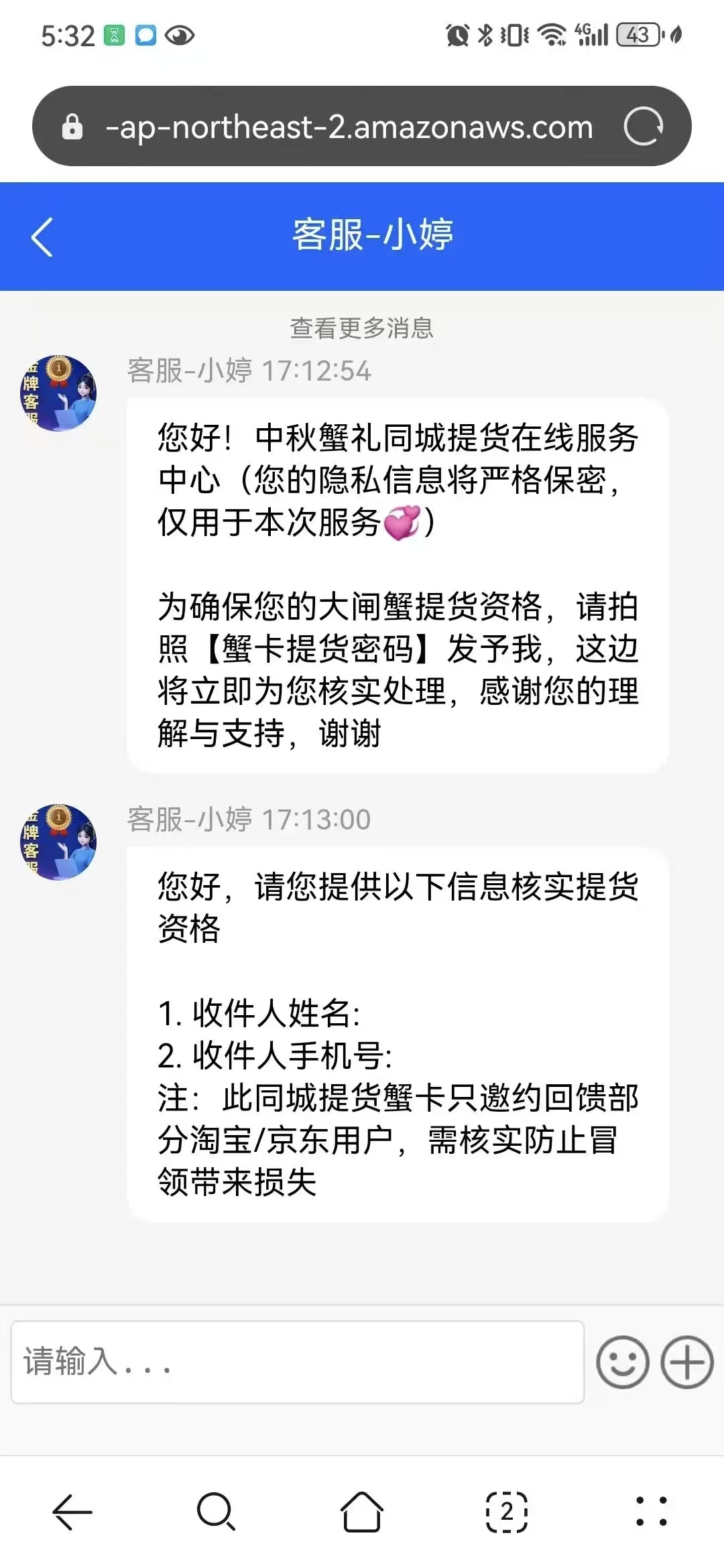 游女士的母亲以为中奖,便拿回家询问如何兑换。看着蟹卡上详细的提货流程和精美的封面,游女士最初并未起疑,于是扫码按照步骤进行操作,打开链接后弹出客服对话框,称需要游女士提供蟹卡密码、收件人姓名,手机号。