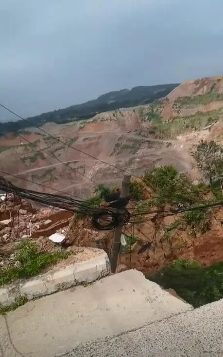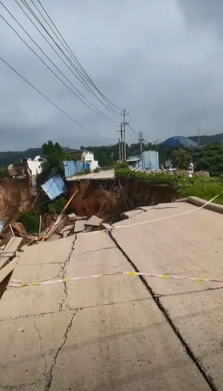 视频显示,一条水泥硬化路面出现断裂坍塌,现场地面上还留有警戒带,附近不远处疑似是一处矿坑。