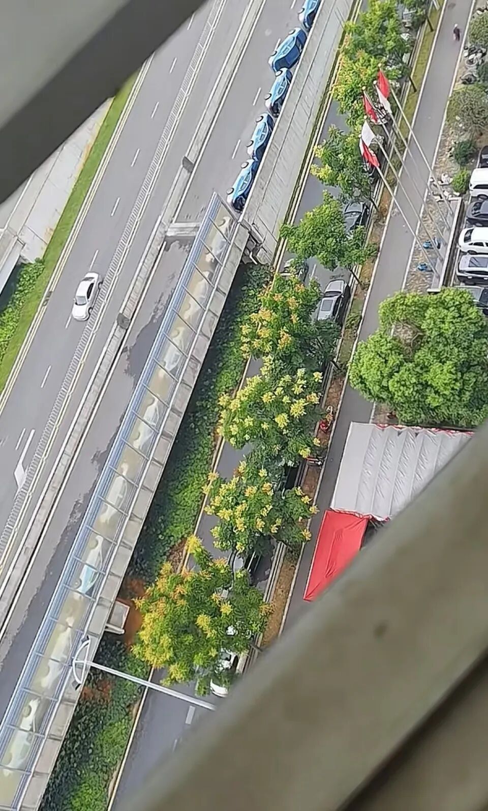视频显示,许多蓝色的出租车整齐有序地侧躺在高架桥一侧,高架桥主干道依然有车行驶。