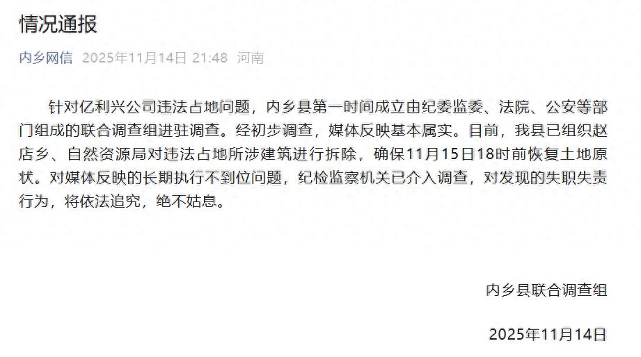 针对亿利兴公司违法占地问题,内乡县第一时间成立由纪委监委、法院、公安等部门组成的联合调查组进驻调查。经初步调查,媒体反映基本属实。