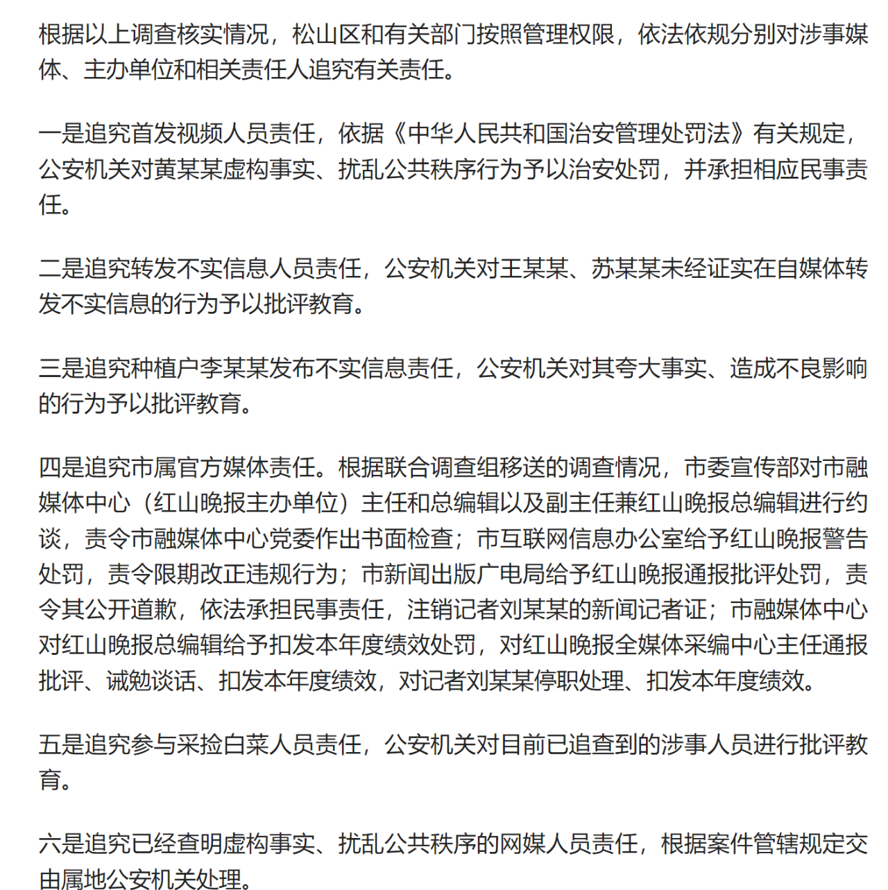 11月17日晚,赤峰市松山区联合调查组发布关于网传“免费采捡白菜”事件调查处理情况的通报,主要明确三点:一是菜地经过多轮择优选收,经过评估实际损失9.52万元,相关责任方已赔偿到位;二是发布视频的首发人员因扰乱社会秩序,受到治安处罚并承担民事责任;三是属地媒体因报道失实,受到通报批评并被责令公开道歉,注销涉事记者新闻证,并停职处理,相关领导同步被追责。