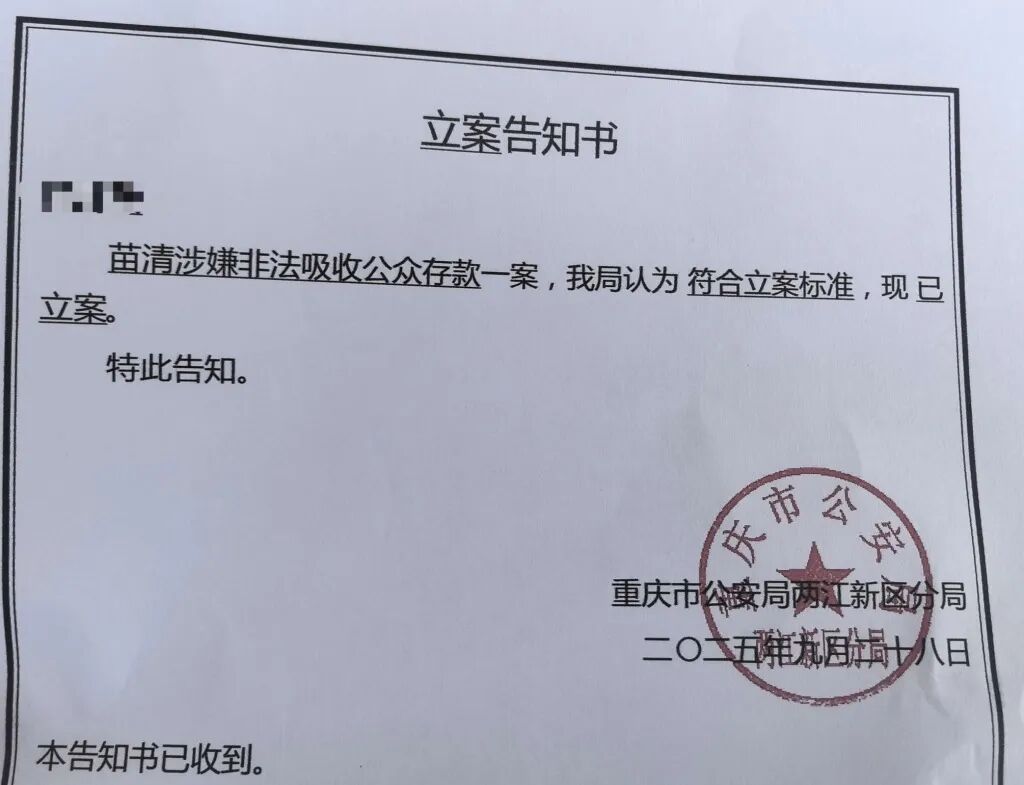 家长提供的一份由重庆市公安局两江新区分局出具的《立案告知书》显示,苗清涉嫌非法吸收公众存款一案,该局认为符合立案标准,现已立案。落款日期为9月28日。澎湃新闻另获悉,苗清已被批准逮捕,案件正在进一步侦办中。