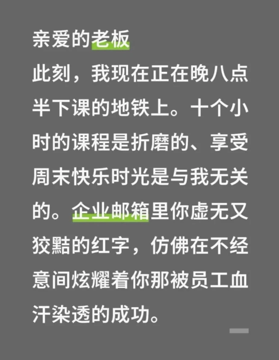 2.其二,年轻员工对于单向的情绪价值供给的免疫力越来越强,更加注重公平原则。员工更希望得到实质性的认可与回报,例如更高的工资、更好的福利或者更多的休息时间,宏大叙事的话术难以激发他们的工作热情。