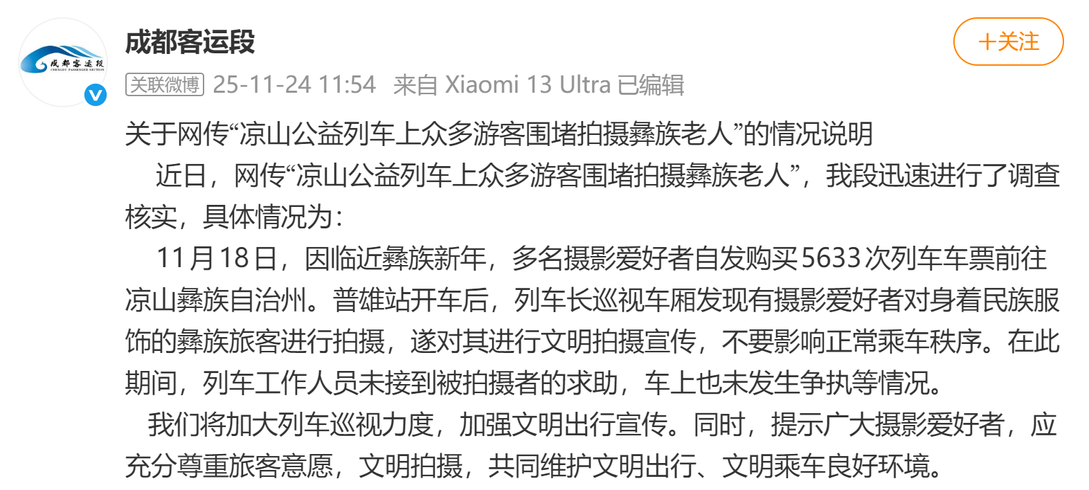 近日,有网友发帖称,在凉山公益列车5633次列车上,有一群游客掏出相机“围堵”一名四川凉山彝族自治州老人进行拍摄。即使被拍摄者明显表现出不适和不愿意,他们依然在拍摄。随后,网友在网上发帖呼吁停止以“记录”为名的伤害。11月24日,成都客运段发布关于网传“凉山公益列车上众多游客围堵拍摄彝族老人”的情况说明,将加大列车巡视力度,加强文明出行宣传。