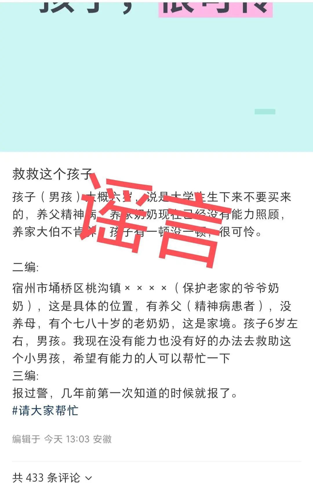 宿州一村民买来男孩却无力抚养?镇政府:系谣言,警方已介入
