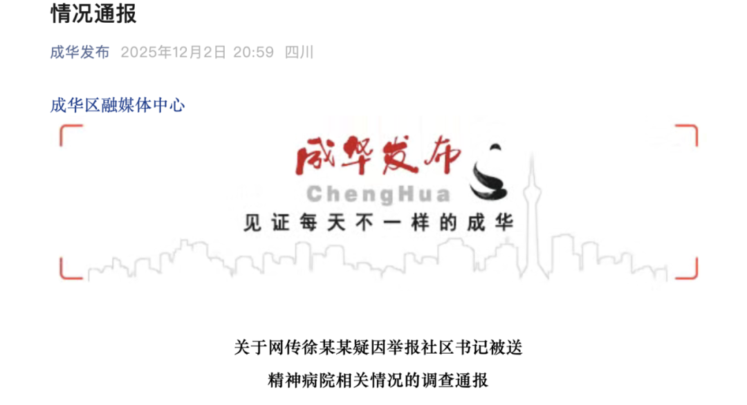 据微信公众号“成华发布”消息,12月2日,四川成都市成华区联合调查组发布《关于网传徐某某疑因举报社区书记被送精神病院相关情况的调查通报》: