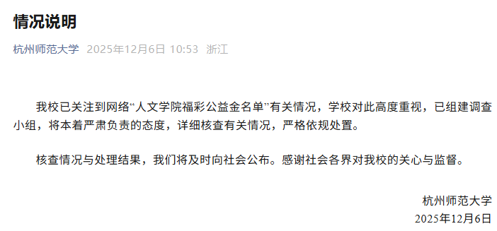 12月5日,有网友注意到,杭州师范大学人文学院官方网站发布的福彩公益金项目受助对象公示中,名单里的部分人名也出自这一文档。