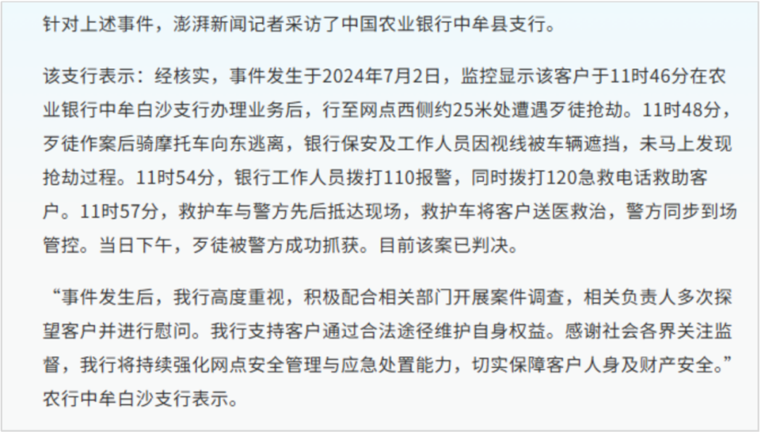 12月2日,中国农业银行中牟白沙支行通过澎湃新闻网回应此事,详细介绍了事件经过。当日,“银行回应男子取170万银行门口遭抢”话题登上微博热搜榜,阅读量超413万。