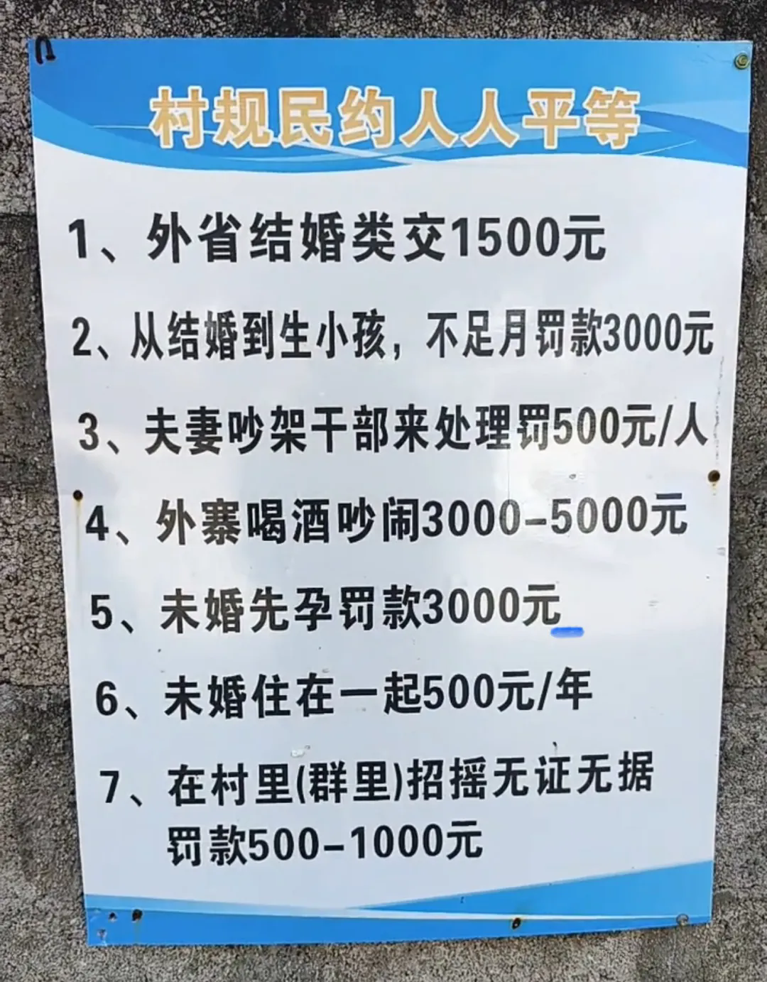 网友发布的视频中,一份新张贴的“村规民约”明确标注了7类事项及罚款金额,包括:外省结婚类交1500元、从结婚到生小孩不足月罚款3000元、夫妻吵架干部来处理罚500元/人、外寨喝酒吵闹3000-5000元、未婚先孕罚款3000元、未婚住在一起500元/年、在村里(群里)招摇无证无据罚款500-1000元。视频发布后引发热议,不少网友在视频评论区留言:“这样的规矩是否合理?”“村里有没有罚款的权利?”