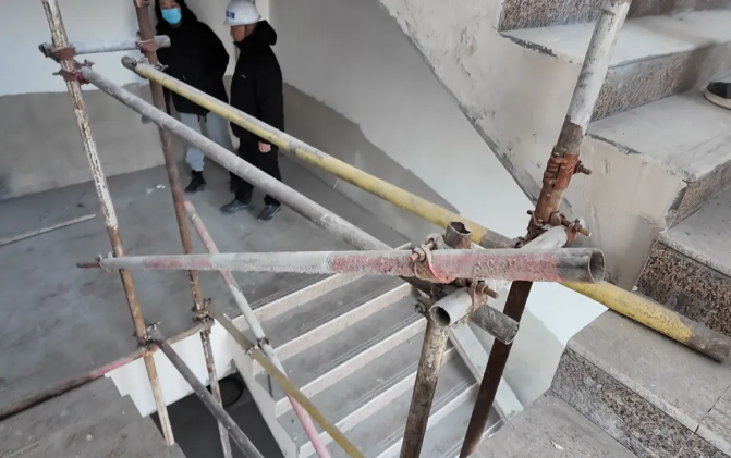 当专家要求开启消防栓进行测试时,负责人解释称,由于工地尚未复工,消防水系统已被关闭。然而,在进一步查看时,考核巡查组留意到房间内有新翻动的泥土、刚铺设的地板,以及一桶浑浊的施工用水,还有几名工人在附近走动——种种迹象表明,室内工程实际上并未停止。