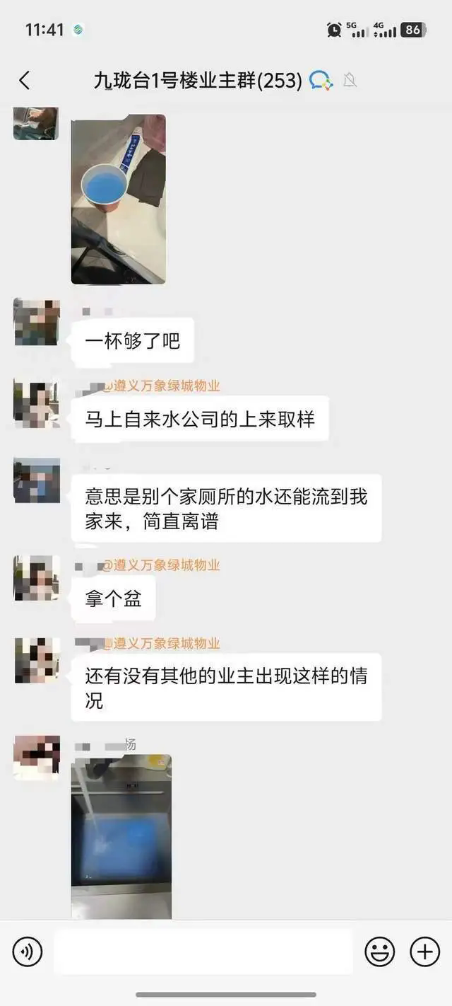 王先生是贵州省遵义市播州区九珑台小区的业主,他说,房子是2024年交付的,大部分业主是当年下半年装修入住的。2025年4月18日,有业主首次发现家里的自来水变成蓝色,“高层颜色淡,低层颜色很深,根本就不敢用”,反映给物业,物业说反馈给自来水公司,但没有结果,还说是业主家里使用了洁厕灵反水。