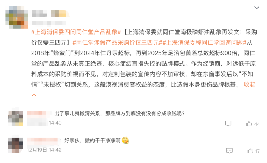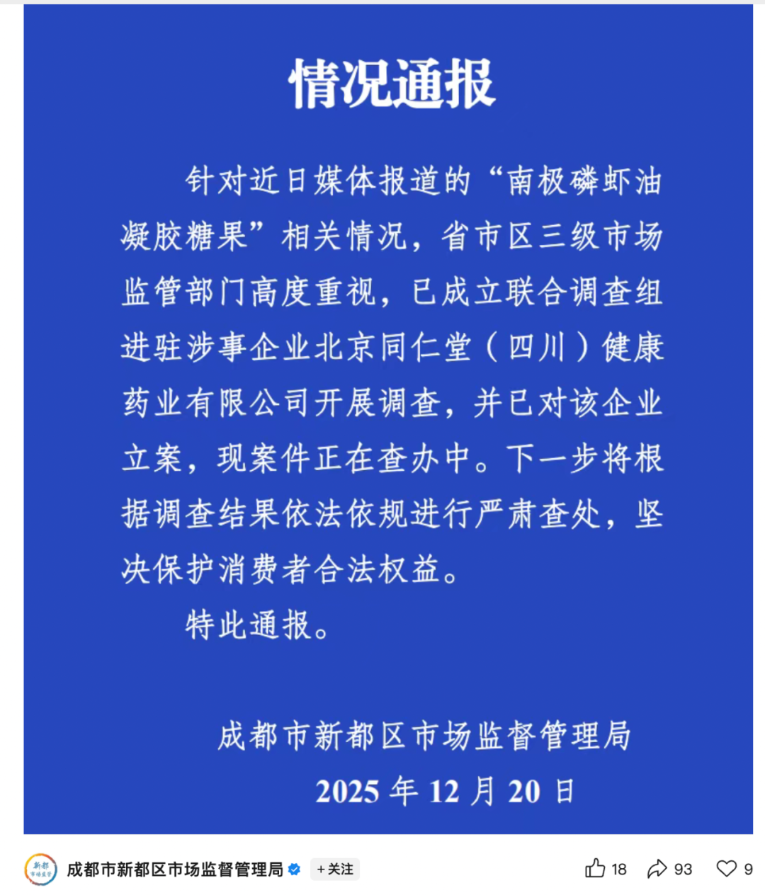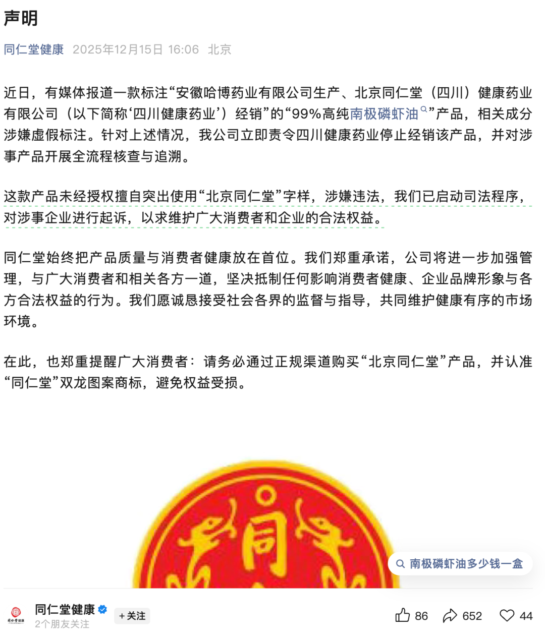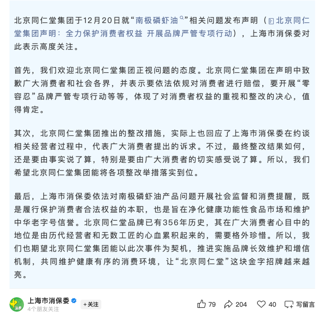 12月11日,上海市消保委官方微信公众号发布关于南极磷虾油的产品测评,指出一款标称“北京同仁堂99%高纯南极磷虾油”的产品,检测结果显示该款产品磷脂含量为0。《中国新闻周刊》、第一财经网、顶端新闻等多家媒体发布报道,舆论持续发酵。