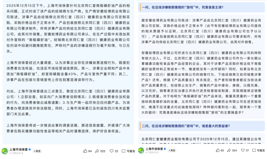 12月16日,上海市消保委官方微信公众号先后发布两篇推文,表示上海市消保委于12月15日约谈涉事北京同仁堂南极磷虾油产品的生产商安徽哈博药业有限公司、经销商北京同仁堂(四川)健康药业有限公司,后者是中国北京同仁堂(集团)有限责任公司的“孙公司”、北京同仁堂健康药业股份有限公司的子公司。约谈中,生产商承认其在生产过程中并未添加对外宣称的“南极磷虾油”。而经销商表示其对产品涉嫌造假行为毫不知情;产品包装突出使用“北京同仁堂”字样、涉事产品在市场上流通均与其无关。上海市消保委认为涉事产品与宣传严重不符,在包装与营销宣传上存在刻意混淆误导行为,并就此事中各涉事主体的应尽之责、获益之人进一步追问。央视财经、央广网等权威媒体介入报道。