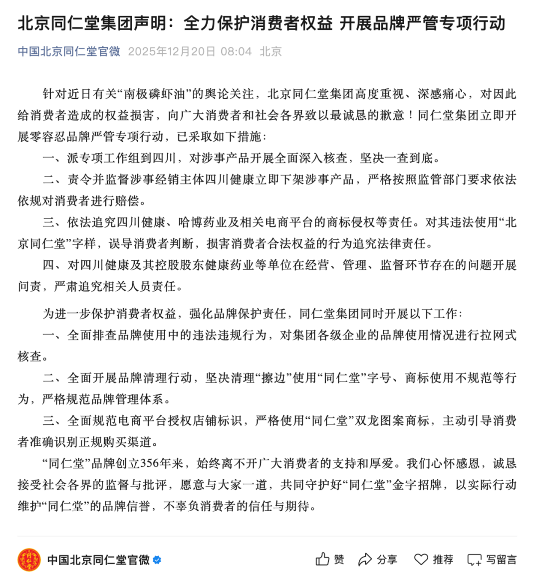 北京同仁堂就南极磷虾油事件致歉,品牌规范管理方能守住百年信誉