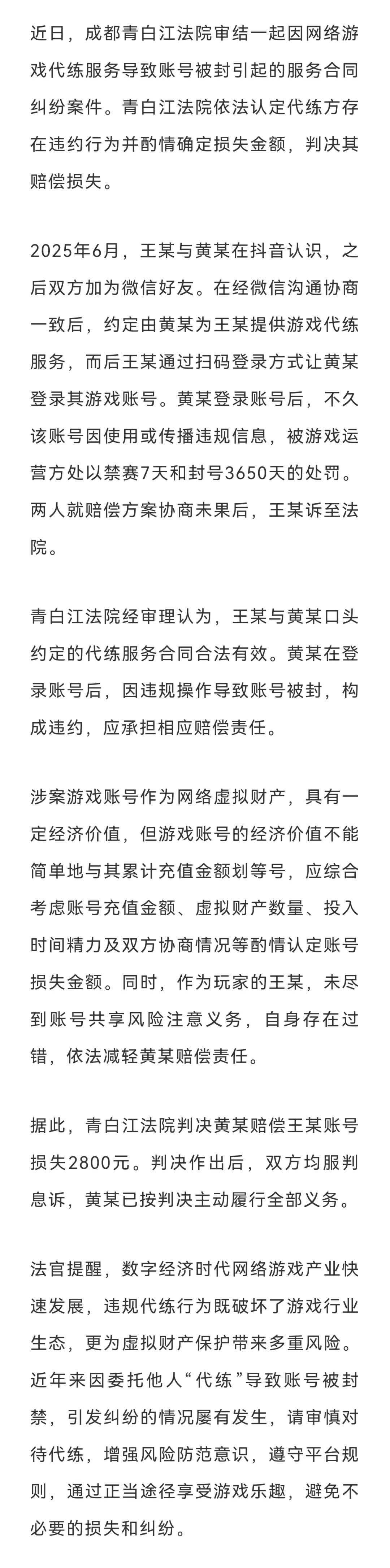 代练游戏却被“封号”?法院判代练者赔偿2800元