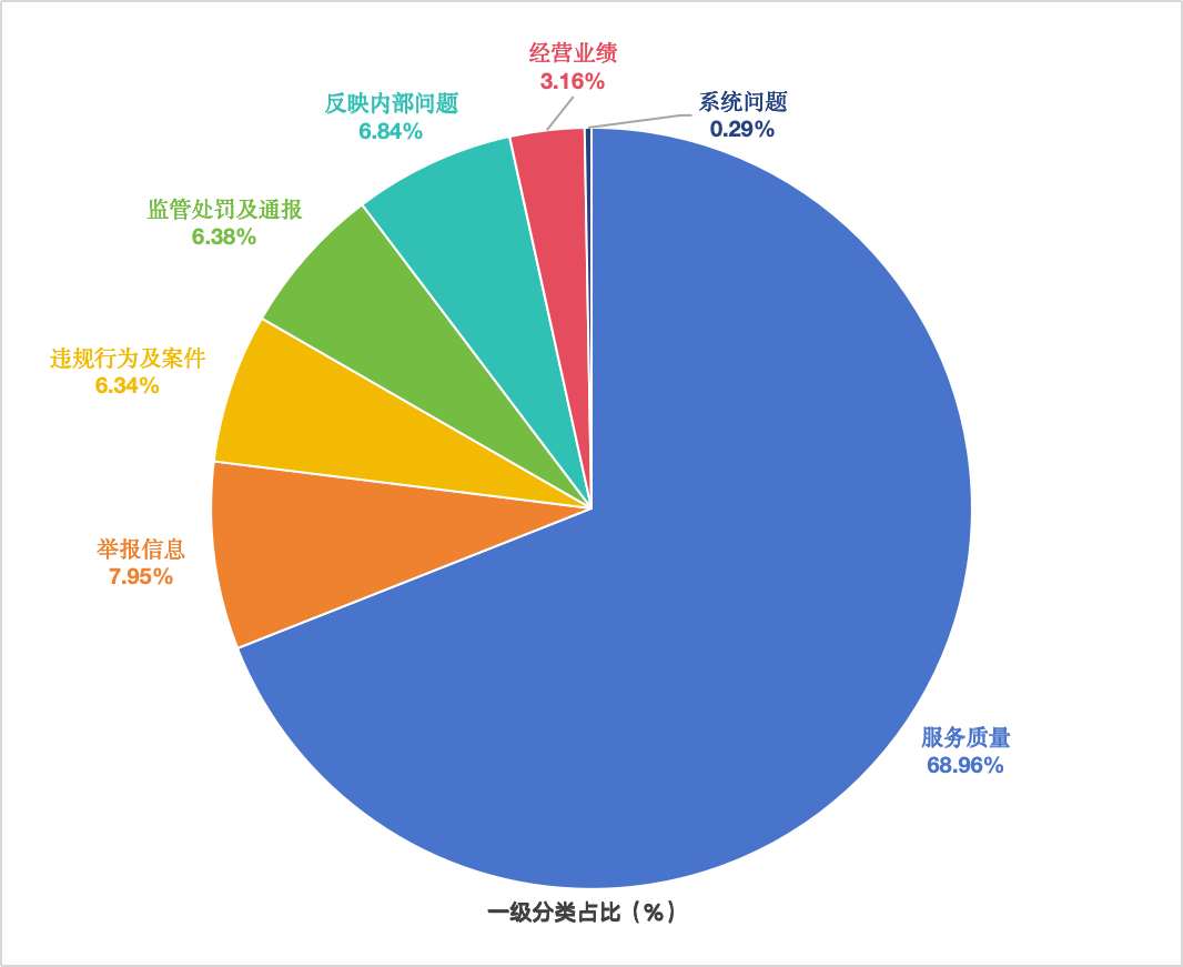 根据37.8万条样本数据显示,“服务质量”一级分类占总量比重高达68.96%,远超“监管处罚”(6.38%)、“违规案件”(6.34%)和“举报信息”(7.95%)等合规类问题。这表明,当前公众对银行业的不满主要集中在服务体验层面,而非系统性风险或重大违规事件。