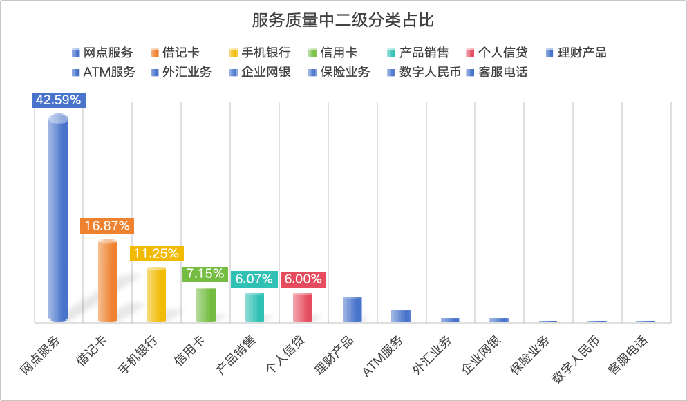进一步拆解,“服务质量”下设的二级分类占比中,网点服务(42.59%)、借记卡(16.87%)、手机银行(11.25%)信用卡(7.15%)和产品销售(6.07%)五项占比超过“服务质量”类投诉的八成,是网民投诉的集中高地,也是服务质量优化的核心战场。个人信贷(6%)投诉量紧随其后,理财产品(3.6%)的问题也比较突出。