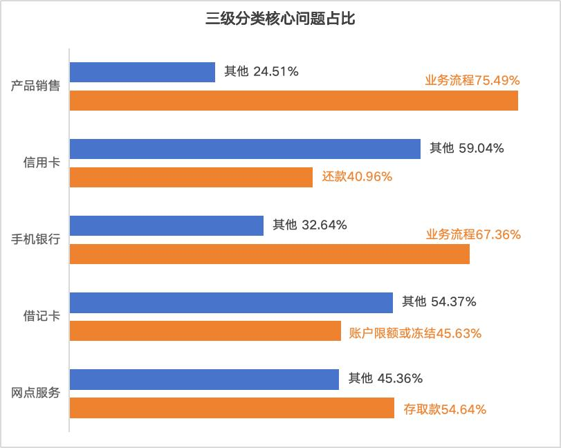 三级分类中,“网点服务-存取款”(54.64%)、“借记卡-账户限额或冻结”(45.63%)、“手机银行-业务流程”(67.36%)、“信用卡-还款”(40.96%)、“产品销售-业务流程”(75.49%)分别位列各自类别的投诉量第一位。