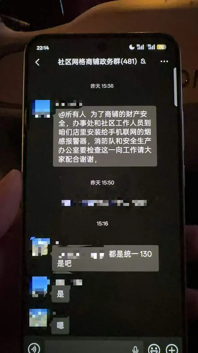 商户吴先生向华商报大风新闻记者描述了当时的场景。1月4日下午3时许,他们商户群内有社区的工作人员称:为了商铺的财产安全,办事处和社区工作人员到咱们店里安装给手机联网的烟感报警器,希望商户配合。