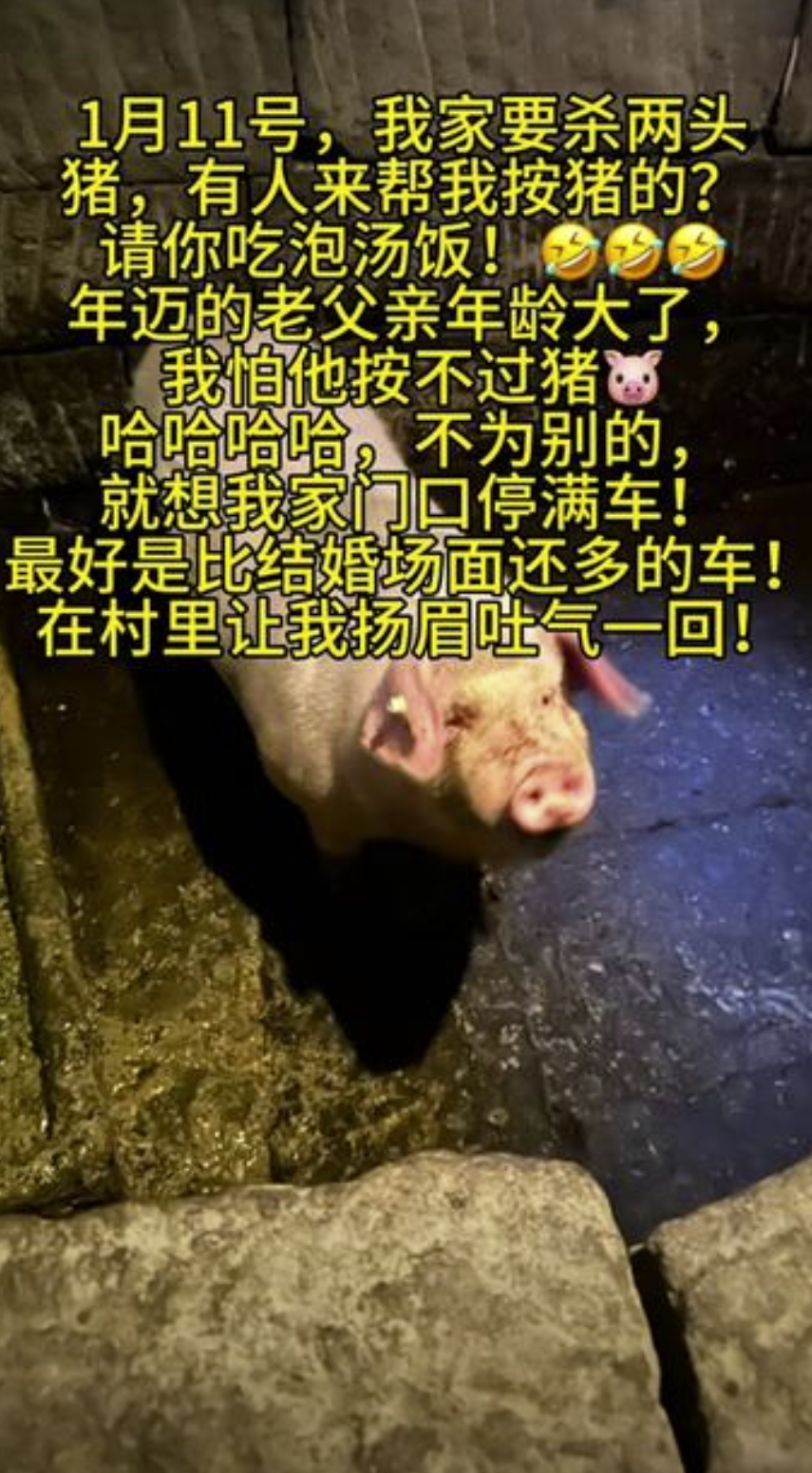 1月9日,抖音用户“呆呆”发布了一条“求助”视频,称在重庆合川区云门街道庆福村家里准备杀猪,但老人“无力按猪”,希望能有网友前往帮忙“按猪”,回报是请网友吃“刨猪汤”。