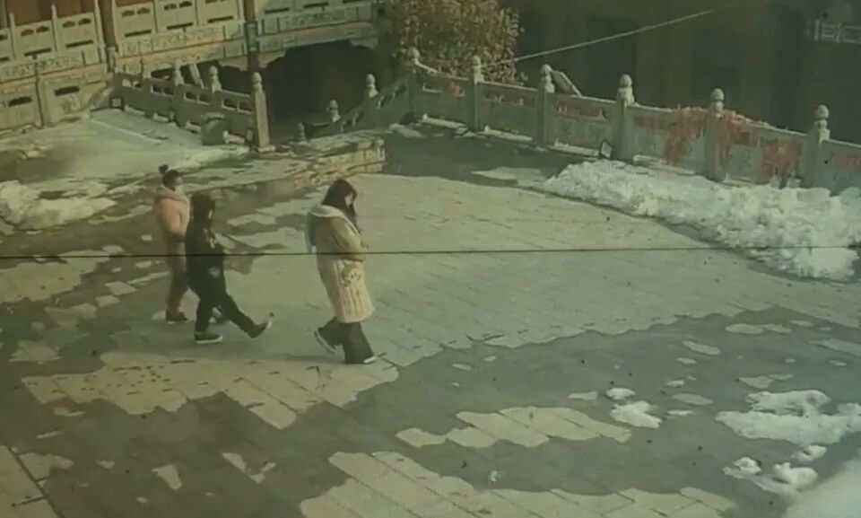 另一条监控视频里,在戴口罩的成年女性陪同下,这名女孩和小男孩走在寺庙院子里。