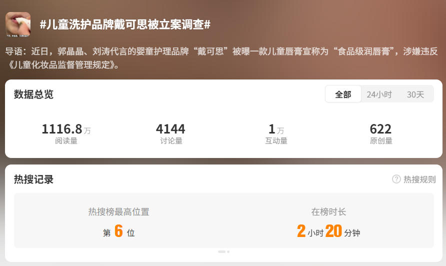 据媒体报道,1月22日无锡市新吴区市场监管局已对戴可思主体企业“无锡戴可思生物科技有限公司”进行立案调查,且媒体报道的同款产品宣传页面中已不见“食品级润唇膏”字眼。1月23日,微博话题“儿童洗护品牌戴可思被立案调查”登上热搜榜单第6名,阅读量达1116.8万。