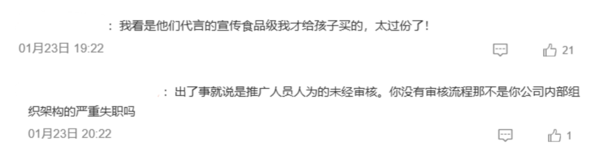 而从消费者认知层面来说,婴童护理产品的安全性能是消费者关注的核心。“食品级”“宝宝误舔无忧”等描述营造出用户对产品可靠、无害的心理预期。当消费者发现该标签仅是营销话术时,产生的不仅是失望,更是被误导使用的不满情绪,进而质疑品牌的安全可靠性。
