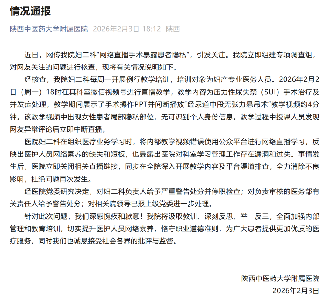 事件发酵后,涉事医院相关工作人员在接受媒体采访时明确表示,已关注到此事,目前正在推进后续处理工作。2月3日下午,陕西中医药大学附属医院通过官方微信号发布情况通报称,该院妇二科微信视频号直播的教学内容为压力性尿失禁(SUI)手术治疗及并发症处理,期间展示了手术操作PPT并间断播放“经尿道中段无张力悬吊术”教学视频约4分钟,出现了女性患者的隐私部位,无可识别个人身份的信息。医院妇二科在组织医疗业务学习时,将内部教学视频错误使用公众平台进行网络直播学习,反映出医护人员网络素养的缺失和短板,也暴露出医院对科室学习管理工作存在漏洞和过失。经医院党委研究决定,对妇二科负责人给予严重警告处分并停职检查;对负责审核的医务部有关责任人给予警告处分;对相关院领导已报上级党委进一步处理。