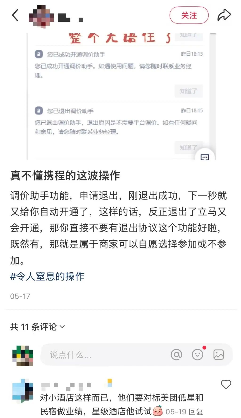 社交平台上不少商家吐槽携程“调价助手”