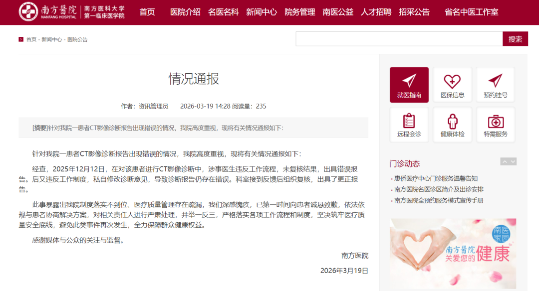 3月19日,南方医科大学南方医院官网发布情况通报。