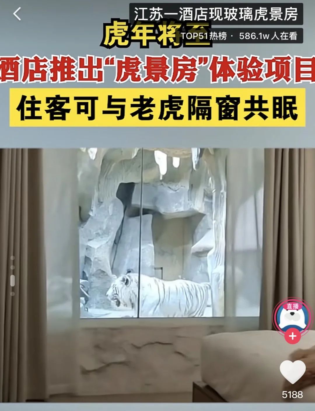 01 据报道,近日,江苏南通一动物园酒店内出现老虎观赏房,在房间内透过一面玻璃可以看到老虎来回走动。该房间的设计引发热议。1月20日,记者从南通市文旅局了解到,已经暂停该项目的宣传和营业。