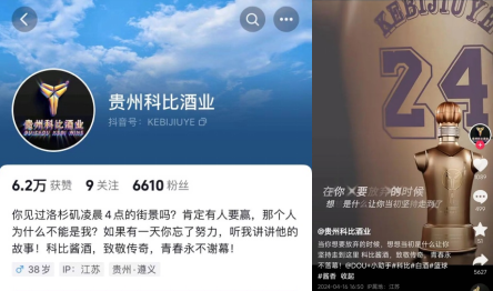近日,抖音平台一个名为“贵州科比酒业”的账号(ID:KEBIJIUYE)引发舆论关注。该账号在简介中写道:你见过洛杉矶凌晨4点的街景吗?肯定有人要赢,那个人为什么不能是我?如果有一天你忘了努力,听我讲讲他的故事!科比酱酒,致敬传奇,青春永不谢幕!该账号发布内容显示,其推出了两款科比酱酒:科8、科24,还发布了多条“体育冠军”为其宣传的视频。截至4月26日,该账号拥有粉丝超6000人,获赞超6.2万,但尚未进行企业认证。