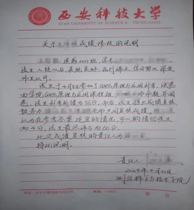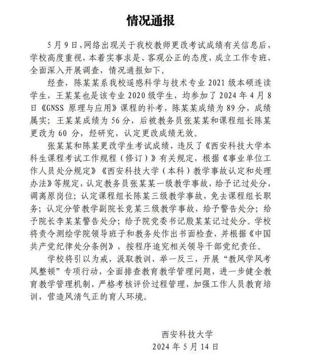 5月14日,西安科技大学发布情况通报称,经查,学生陈某某与王某某均参加了2024年4月8日《导航卫星系统原理与应用》课程的补考,陈某某成绩为89分,成绩属实;王某某成绩为56分,后被教务员张某某和课程组长陈某更改为60分,经研究,认定更改成绩无效。