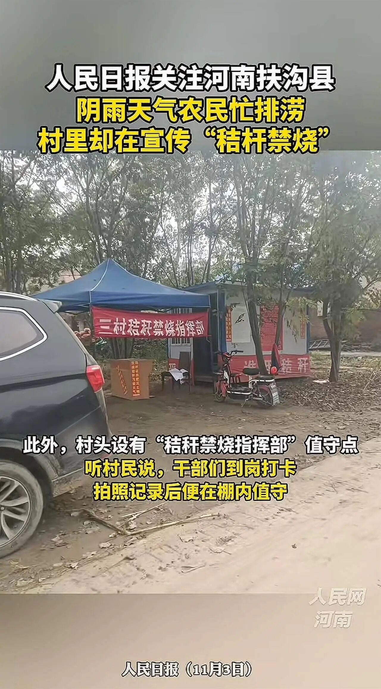 11月3日,《人民日报》刊登河南扶沟县李先生的读者来信《阴雨天气却宣传“禁烧”村里工作过于死板》,称河南周口市扶沟县崔桥镇多个村庄正逢秋汛过后抢收抢种的关键时节,田间地头的积水尚未完全退去,村民们蹚着泥水争分夺秒地排涝、抢收玉米,或者平整土地、准备播种小麦。然而,村里的大喇叭却在循环播放:“严禁焚烧秸秆,违者依法处罚”“禁止燃放烟花爆竹,发现即严肃处理”,还挂着“做守法公民 当禁烧模范”的横幅。此外,村头还设有“秸秆禁烧指挥部”值守点。听村民说,干部们到岗打卡,拍照记录后便在棚内值守。