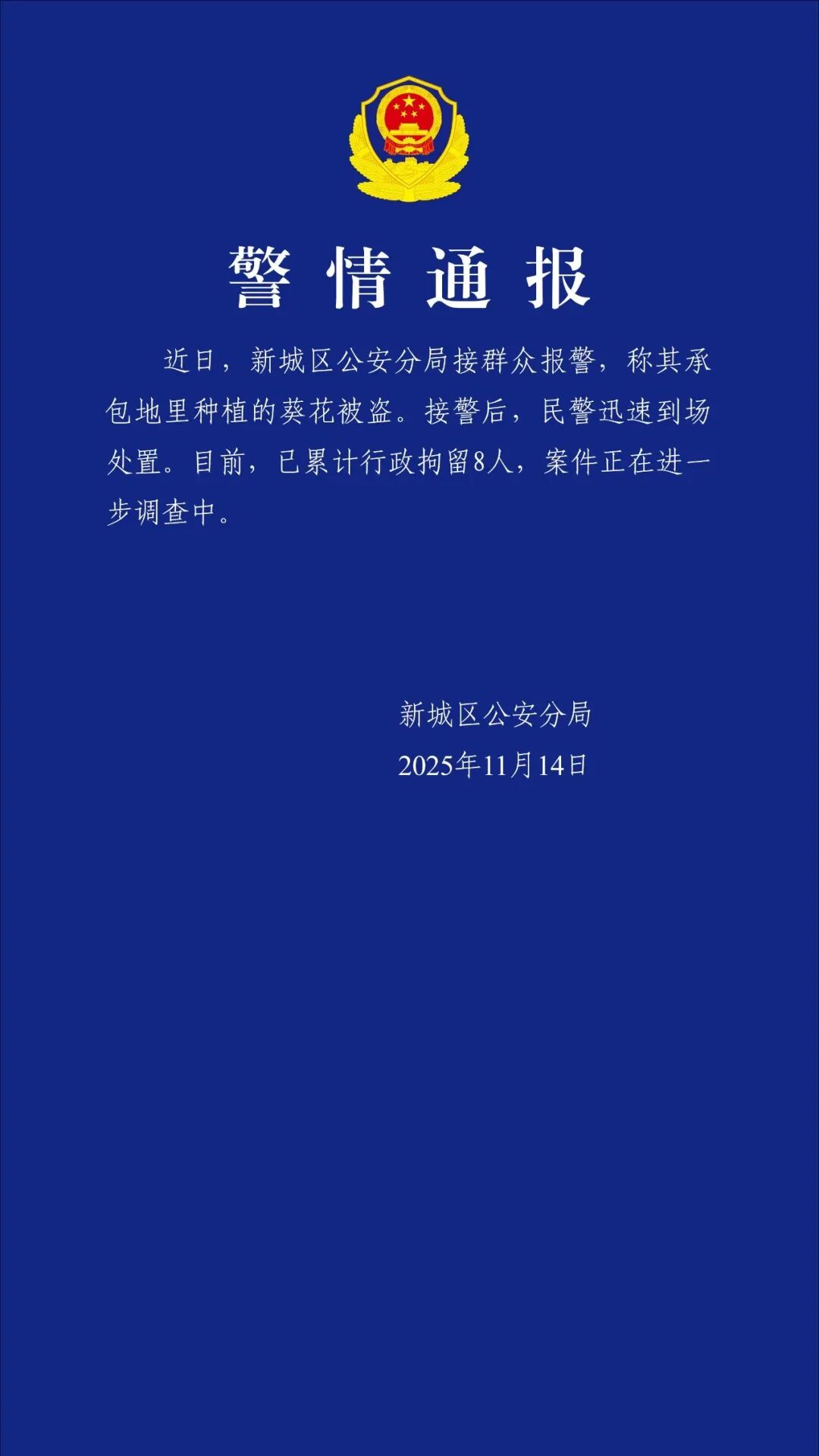 11月14日,当地警方发布通报:近日接群众报警称承包地葵花被盗,目前已累计行拘8人,案件正在调查中。11月19日,新城区宣传部工作人员告诉记者,经核查,受损向日葵面积50多亩,价值10多万元,“之前的数据是种植户自己估计的。”
