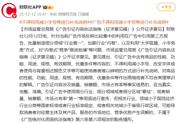 不得利用减小字号等进行补充说明,市场监管总局就《广告引证内容执法指南(征求意见稿)》公开征求意见