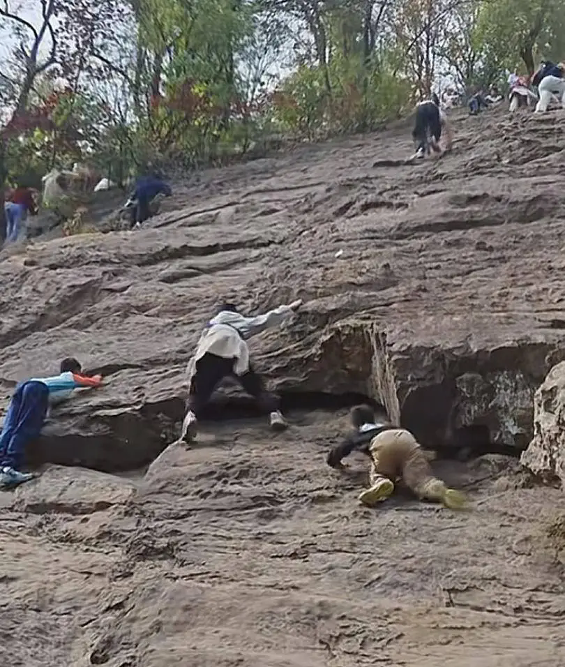 记者也从网友发布的视频中看到,很多家长带着孩子来这里攀爬挑战。“非常陡的坡,自己爬就够离谱的,让孩子也爬,真不知道怎么想的!”有网友称,下面立了不准攀爬的牌子,喇叭也在喊,好多小孩子依旧去爬,没有任何防护措施也没有抓手的地方。记者注意到,在网友指出此举存在风险的同时,有回帖称,“小孩灵活得很,大人能爬上去小孩肯定可以!”