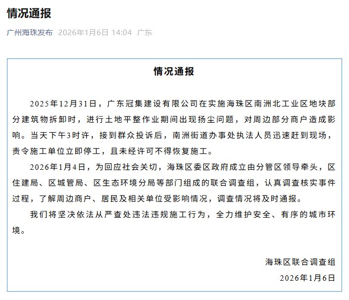 2026年1月6日,广州市海珠区联合调查组发布情况通报: