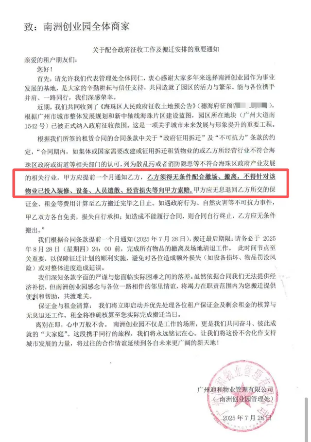 据了解,该地块的动荡始于2025年7月。根据广州市海珠区人民政府发布的征收土地预公告,该地块被纳入广州新中轴海珠片区改造范围。随后,地块出租方“广州市海珠区南洲街三滘第三、第四经济合作社”及物业管理者“广州迎和物业管理有限公司”等,向园区内租户发出了搬迁通知。