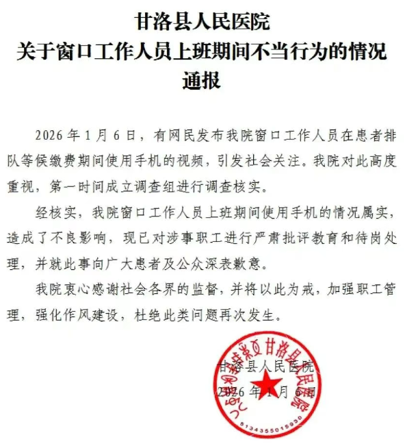 近日,四川甘洛县人民医院一名收费员被曝在工作时间玩手机,引发网络关注。1月6日,医院通报确认该收费员存在上班期间玩手机的行为,违反了工作纪律。医院表示,相关人员已被待岗,后续将根据调查结果进一步处理。