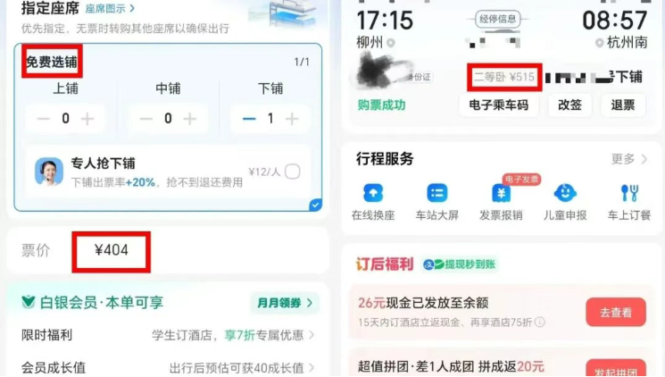 在第三方购票平台上,二等卧铺票价显示为404元,且标注了“免费选铺”,支付时价格却变成了515元。图/央视新闻