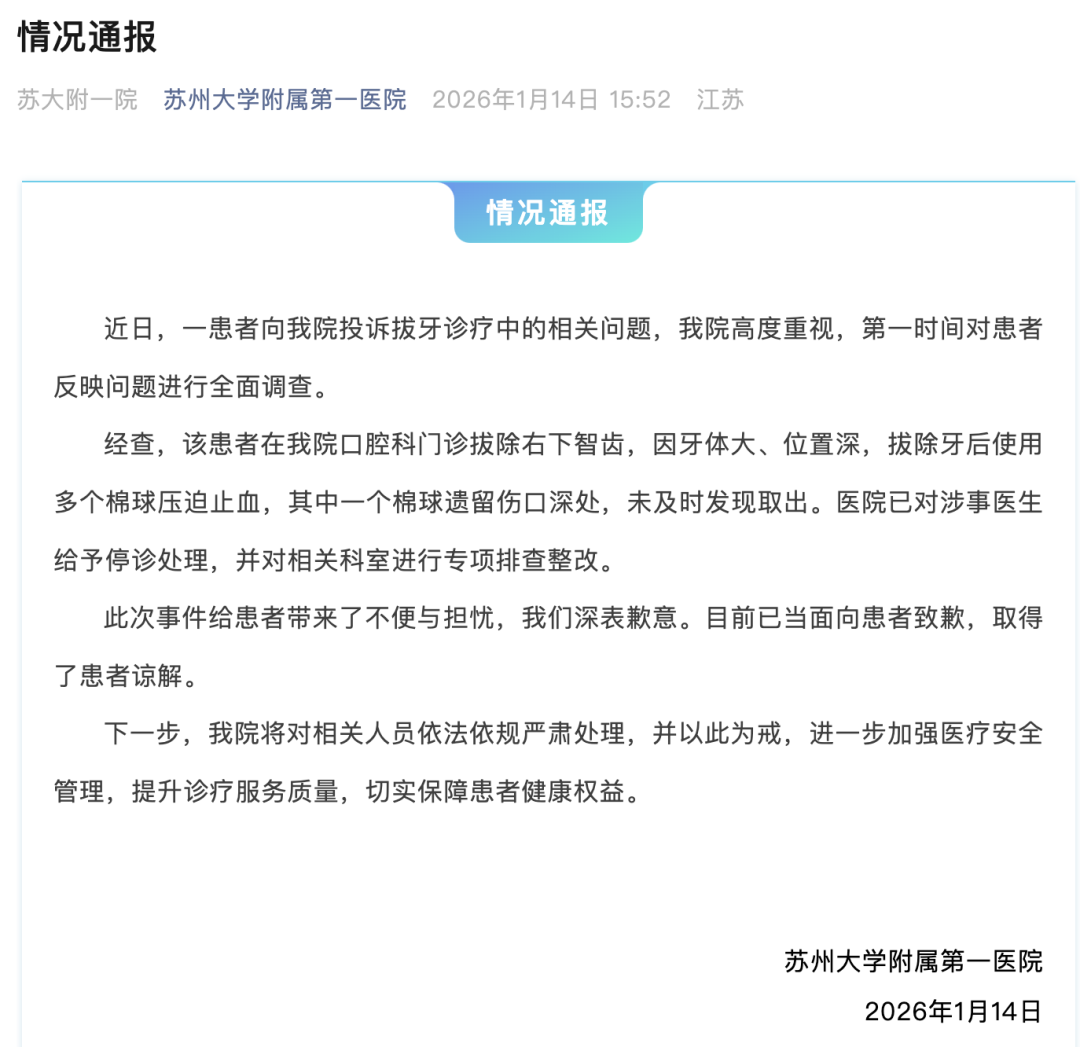 男子拔牙后棉球留伤口半月,苏大附一院通报致歉