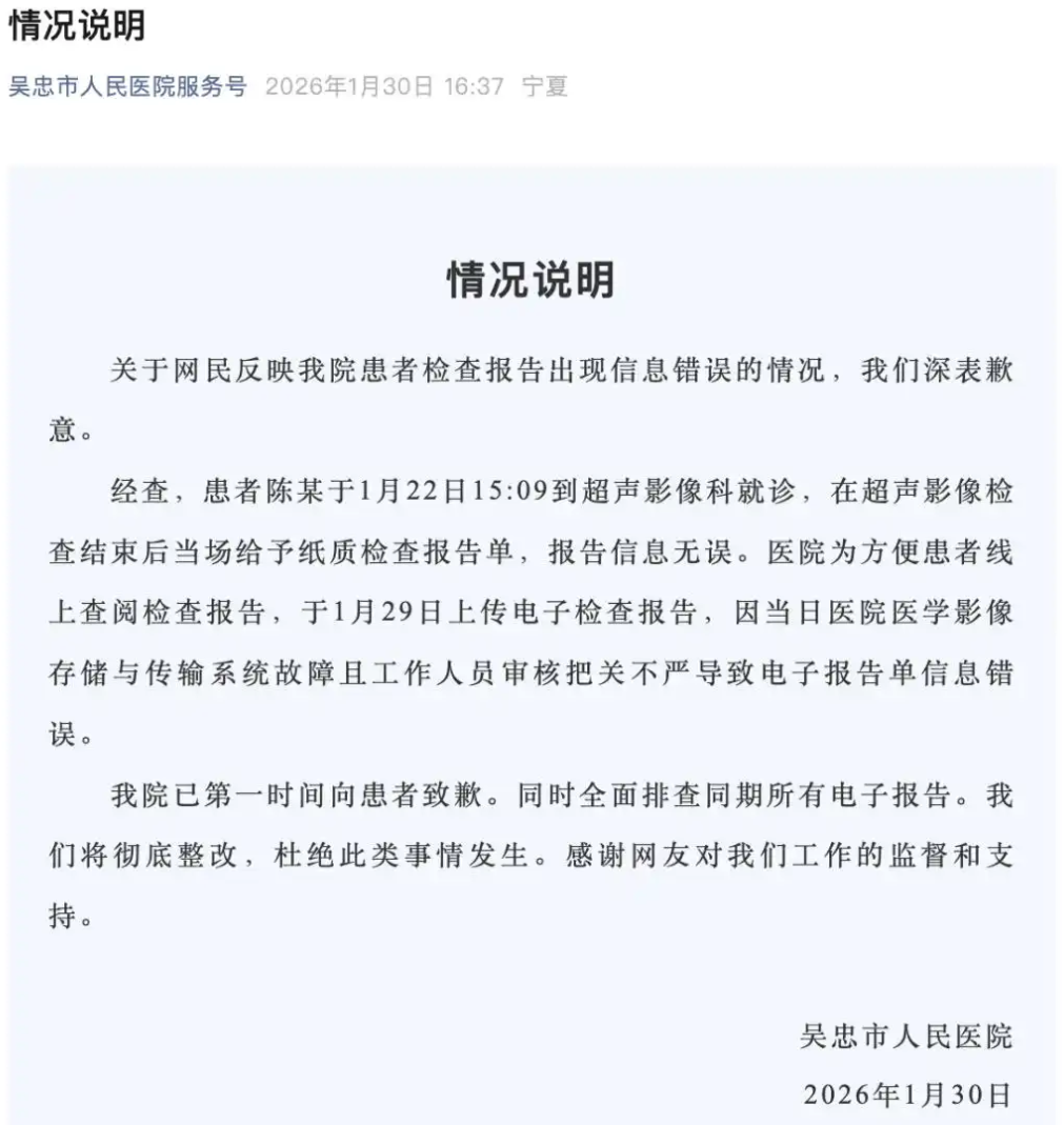 关于网民反映医院患者检查报告出现信息错误的情况,吴忠市人民医院深表歉意。经查,患者陈某于1月22日15:09到超声影像科就诊,在超声影像检查结束后当场给予纸质检查报告单,报告信息无误。