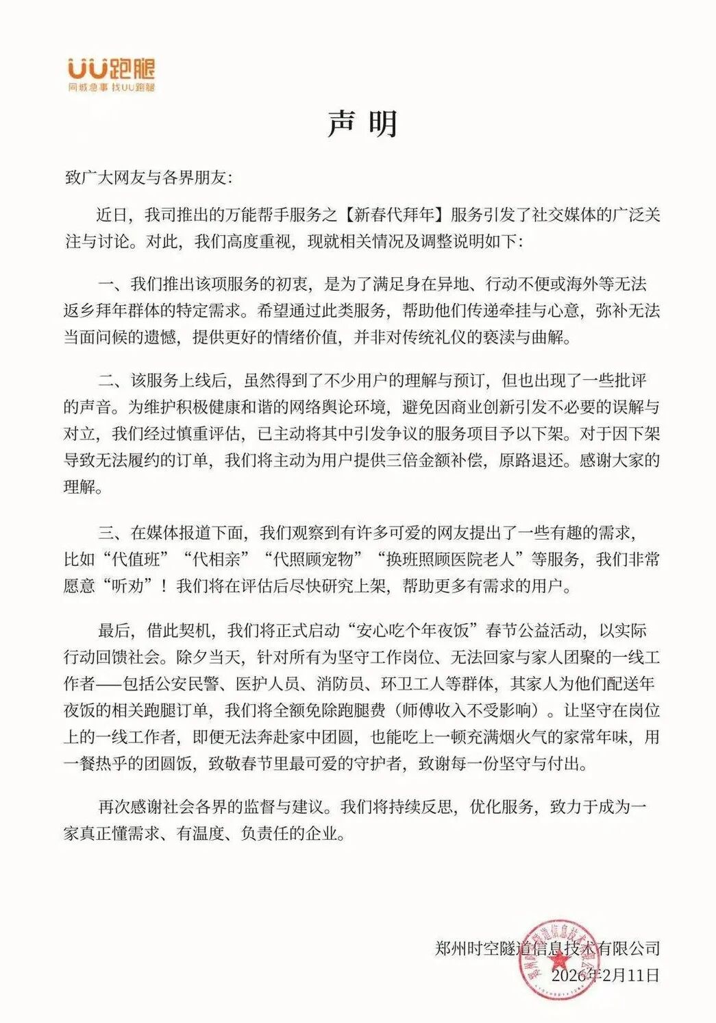 2月11日,UU跑腿在官方微信发布关于代拜年服务的情况说明称,为维护积极健康和谐的网络舆论环境,避免因商业创新引发不必要的误解与对立,公司经过慎重评估,已主动将其中引发争议的服务项目予以下架。对于因下架导致无法履约的订单,公司将为用户提供三倍金额补偿。