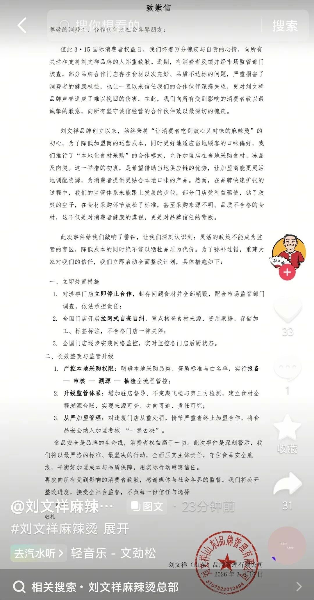 3月16日,刘文祥麻辣烫发布致歉信,提到将对涉事门店立即停止合作,封存问题食材并全部销毁;全国门店开展拉网式自查自纠;全国门店逐步安装网络监控,实时监控各门店后厨状态等手段,进行立即处置。还将通过严控本地采购权限、升级监管体系、从严加盟管理等做法,实现长效整改与监管升级。