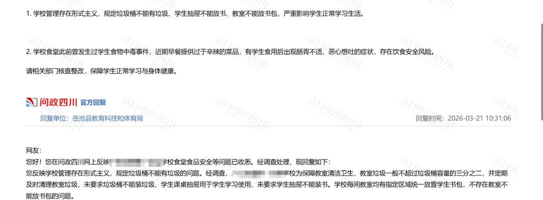 3月21日,岳池县教育科技和体育局回复称,经调查,学校为保障教室清洁卫生,教室垃圾一般不超过垃圾桶容量的三分之二,并定期及时清理教室垃圾,未要求垃圾桶不能装垃圾;学生课桌抽屉用于学生学习使用,未要求学生抽屉不能装书;学校每间教室均有指定区域统一放置学生书包,不存在教室不能放书包的问题。