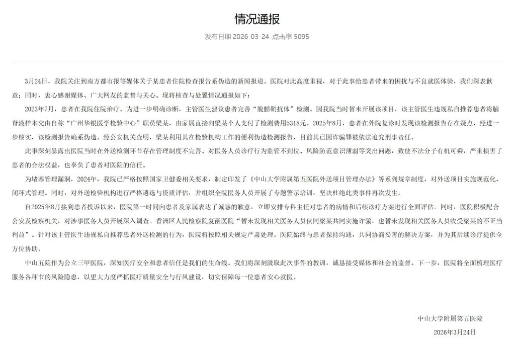 3月24日,中山大学附属第五医院发布情况通报称,24日,该院关注到南方都市报等媒体关于某患者住院检查报告系伪造的新闻报道。医院对此高度重视,对于此事给患者带来的困扰与不良就医体验,我们深表歉意;同时,衷心感谢媒体、广大网友的监督与关心。现将核查与处置情况通报如下: